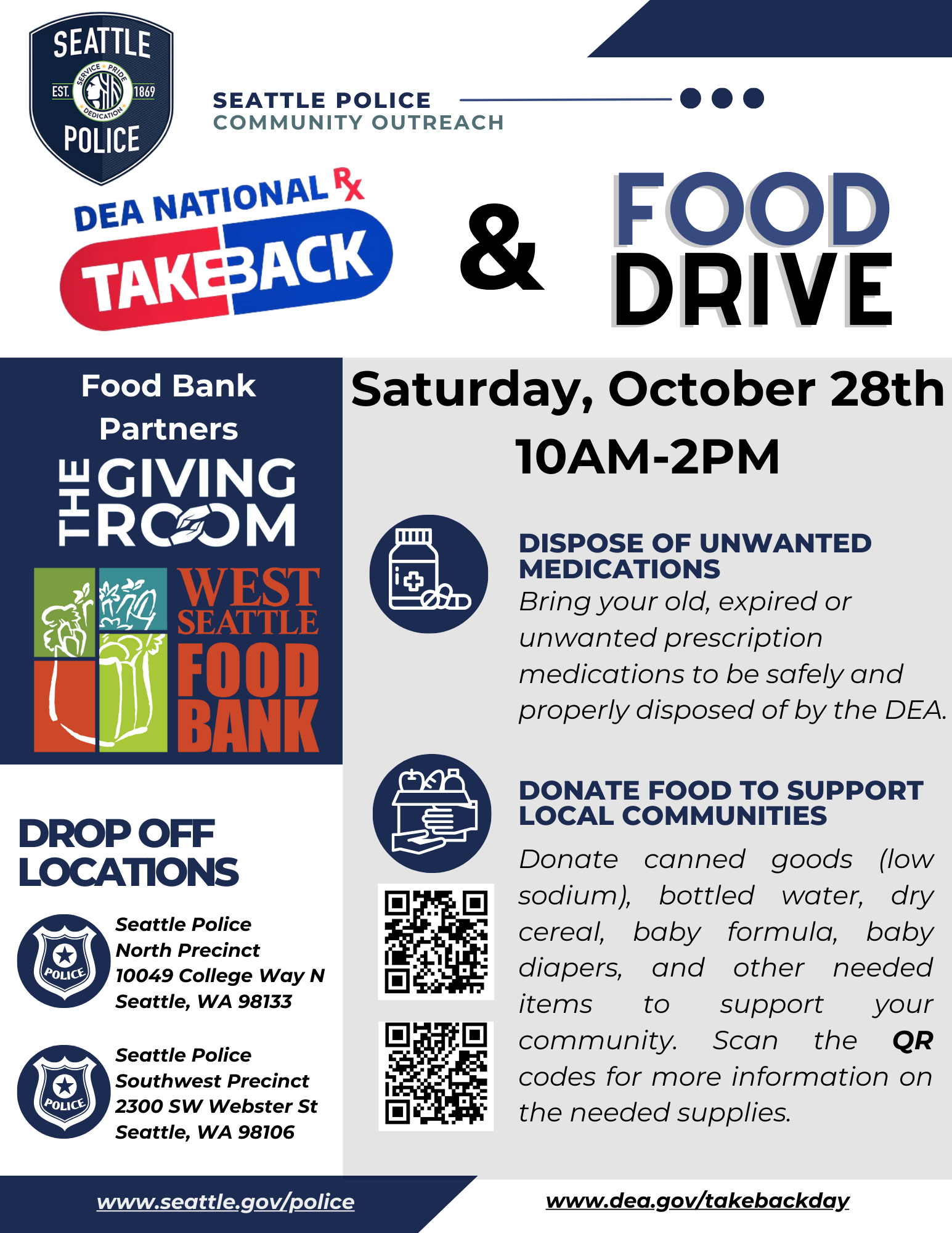 SPD is hosting DEA Drug Take Back and Food Drive on October 28th from 10 to 2 at the North and SW Precincts.